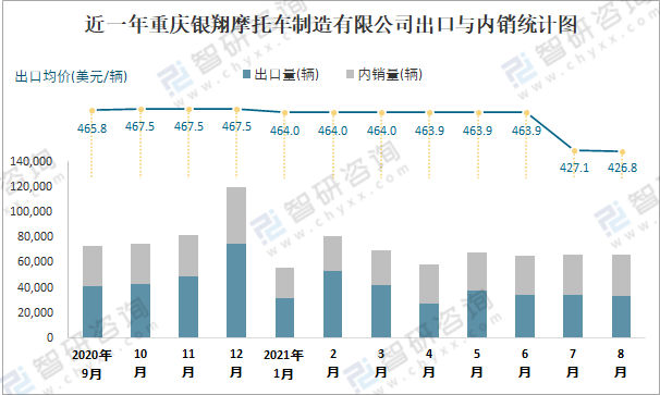 根據(jù)中國汽車工業(yè)(摩托車)產(chǎn)銷快訊數(shù)據(jù)統(tǒng)計(jì)可知:近一年重慶銀翔摩托車制造有限公司(摩托車)共清倉庫存2442輛,其產(chǎn)銷率存在一定幅度波動(dòng),2月產(chǎn)銷率最高(105.79%),清倉庫存4454輛,1月產(chǎn)銷率偏低(85.73%),積壓庫存9396輛;近一年重慶銀翔摩托車制造有限公司(摩托車)出口量偏少,銷量以內(nèi)銷為主,總出口量占比總銷量的57.1%,出口均價(jià)6月起逐月遞減,其中8月出口量為33965輛,出口均價(jià)約為426.84美元/輛;2021年1-8月重慶銀翔摩托車制造有限公司(摩托車)累計(jì)出口量為295129輛,同比增長0.87%,累計(jì)出口金額約為13440.59萬美元,同比下降1.04%。