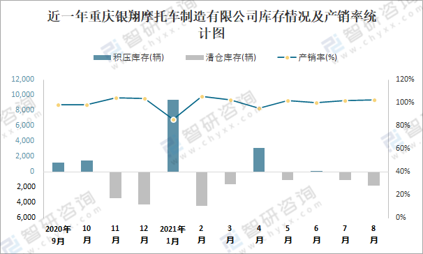 近一年重慶銀翔摩托車制造有限公司庫存情況及產(chǎn)銷率統(tǒng)計(jì)圖