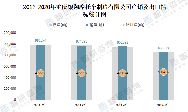 2017-2020年重慶銀翔摩托車制造有限公司產(chǎn)銷及出口情況統(tǒng)計(jì)圖