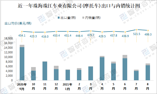 根據中國汽車工業(摩托車)產銷快訊數據統計可知:近一年珠海珠江車業有限公司(摩托車)共清倉庫存84輛,其產銷率存在一定幅度波動,2月產銷率最高(112.62%),清倉庫存598輛,1月產銷率偏低(88.89%),積壓庫存589輛;近一年珠海珠江車業有限公司(摩托車)總體銷量以出口為主,總出口量占比總銷量的90.1%,出口均價7月達到最高值,此后有所下滑,其中8月出口量為6527輛,出口均價約為499.3美元/輛;2021年1-8月珠海珠江車業有限公司(摩托車)累計出口量為52380輛,同比下降24.95%,累計出口金額約為2405.68萬美元,同比下降17.82%。