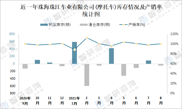 近一年珠海珠江車業有限公司庫存情況及產銷率統計圖
