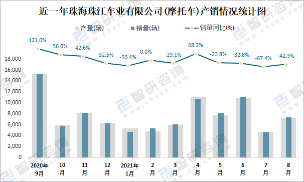 根據中國汽車工業(摩托車)產銷快訊數據顯示:2021年8月珠海珠江車業有限公司(摩托車)產量為7260輛,同比下降42.83%,銷量為7309輛,同比下降42.32%;2021年1-8月珠海珠江車業有限公司(摩托車)累計產量為57635輛,同比下降24.51%,累計銷量為57666輛,同比下降25.62%;2016-2020年珠海珠江車業有限公司(摩托車)產銷量2018年跌至最低值,此后逐年遞增,且近5年總銷量大于總產量,清倉庫存822輛,總體銷量以出口為主。