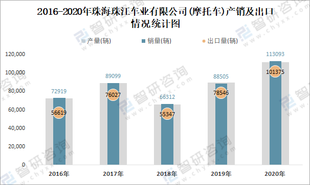 2016-2020年珠海珠江車業有限公司產銷及出口情況統計圖