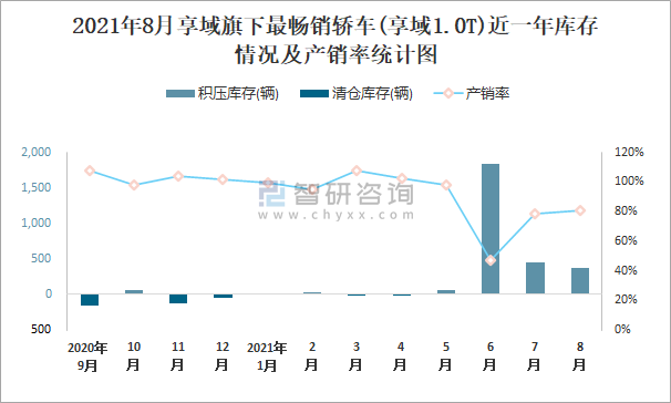 2021年8月享域旗下最暢銷(xiāo)車(chē)(享域1.0T)近一年庫(kù)存情況及產(chǎn)銷(xiāo)率統(tǒng)計(jì)圖