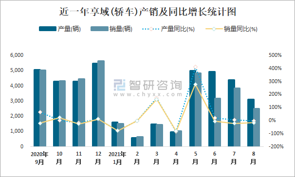 近一年享域(轎車(chē))產(chǎn)銷(xiāo)及同比增長(zhǎng)統(tǒng)計(jì)圖