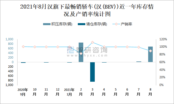 2021年8月漢旗下最暢銷車(漢(BEV))近一年庫存情況及產銷率統計圖