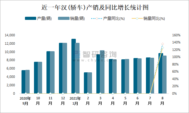 根據中國汽車工業協會數據可知:2021年8月漢(轎車)產量為9634輛,同比增長136.7%,銷量為9035輛,同比增長125.9%,當月產銷率為93.78%;2021年1-8月漢(轎車)累計產量為70556輛,同比下降0%,累計銷量為69788輛,同比下降0%,累計產銷率為98.91%;且2020年漢(轎車)總產量大于總銷量,積壓了庫存14輛。