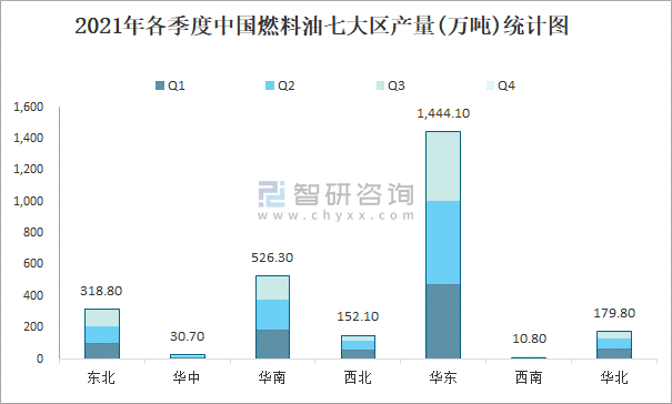 2021年各季度中國燃料油七大區(qū)產(chǎn)量統(tǒng)計(jì)圖