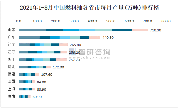 2021年1-8月中國燃料油各省市每月產(chǎn)量排行榜