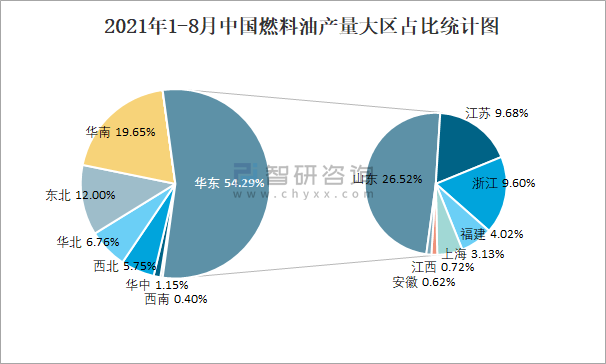 2021年1-8月中國燃料油產(chǎn)量大區(qū)占比統(tǒng)計(jì)圖