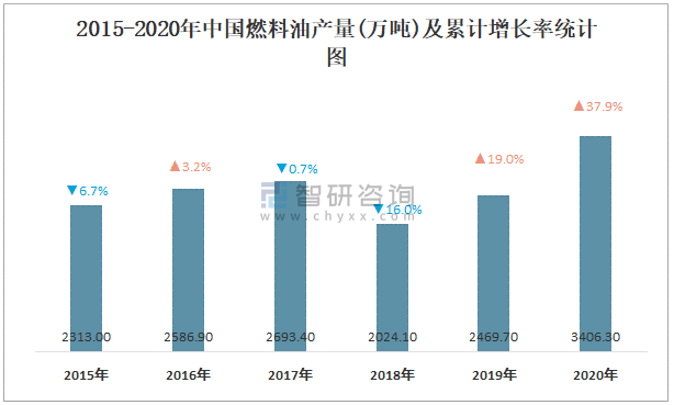 2015-2020年中國燃料油產(chǎn)量及累計(jì)增長率統(tǒng)計(jì)圖