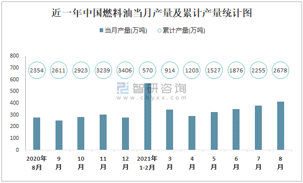 近一年中國燃料油當(dāng)月產(chǎn)量及累計(jì)產(chǎn)量統(tǒng)計(jì)圖