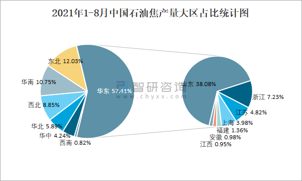 2021年1-8月中國石油焦產(chǎn)量大區(qū)占比統(tǒng)計(jì)圖