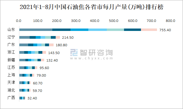 2021年1-8月中國石油焦各省市每月產(chǎn)量排行榜
