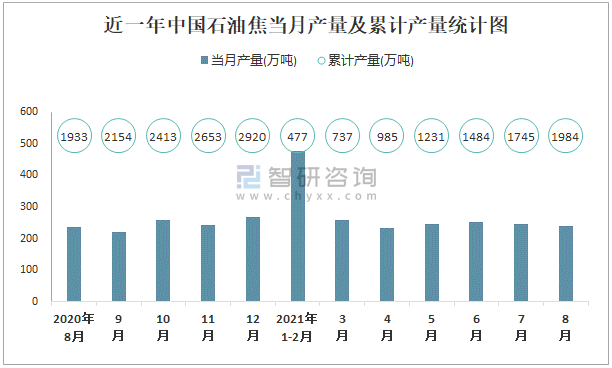 近一年中國石油焦當(dāng)月產(chǎn)量及累計(jì)產(chǎn)量統(tǒng)計(jì)圖