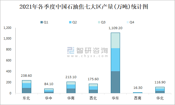 2021年各季度中國石油焦七大區(qū)產(chǎn)量統(tǒng)計(jì)圖