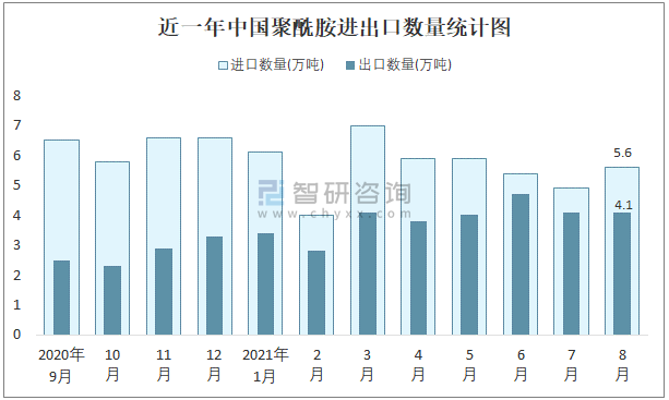 2021年8月中國聚酰胺進出口數(shù)量分別為5.6萬噸和4.1萬噸