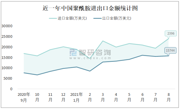 近一年中國聚酰胺進出口金額統(tǒng)計圖
