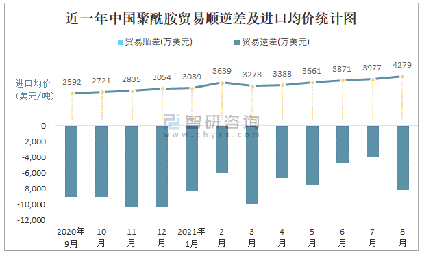 近一年中國聚酰胺順逆差及進口均價統(tǒng)計圖