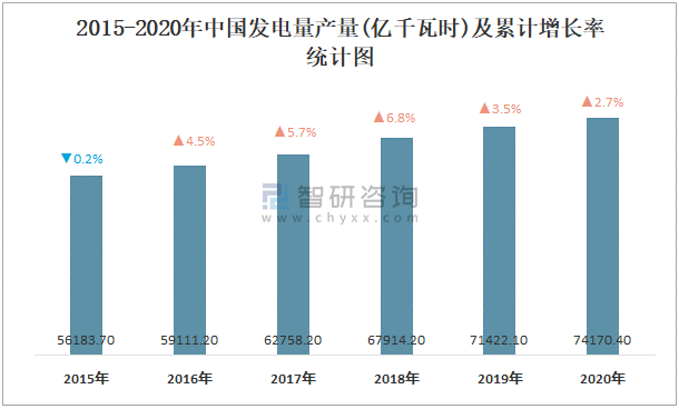 2015-2020年中國發(fā)電量產(chǎn)量及累計增長率統(tǒng)計圖