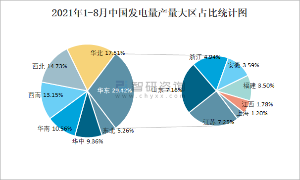2021年1-8月中國發(fā)電量產(chǎn)量大區(qū)占比統(tǒng)計圖