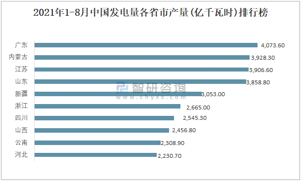2021年1-8月中國發(fā)電量各省市產(chǎn)量排行榜