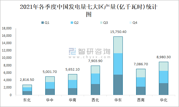2021年各季度中國發(fā)電量七大區(qū)產(chǎn)量統(tǒng)計圖