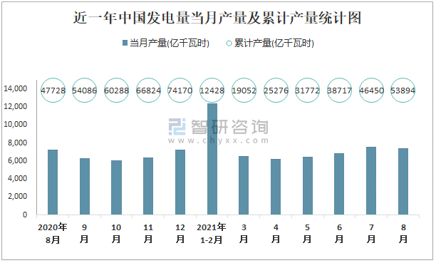 近一年中國發(fā)電量當(dāng)月產(chǎn)量及累計產(chǎn)量統(tǒng)計圖
