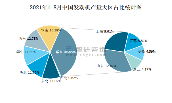 2021年1-8月中國(guó)發(fā)動(dòng)機(jī)產(chǎn)量大區(qū)占比統(tǒng)計(jì)圖