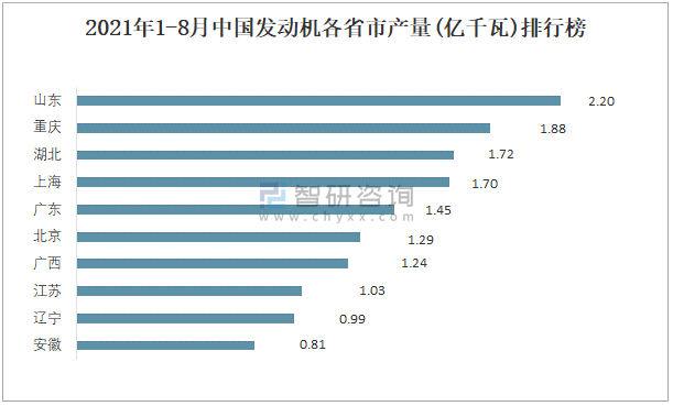 2021年1-8月中國(guó)發(fā)動(dòng)機(jī)各省市產(chǎn)量排行榜
