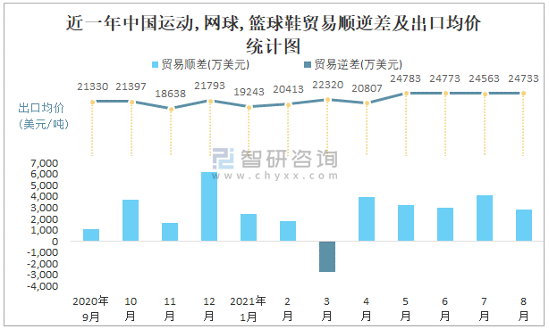 根據中國海關數據顯示:2021年8月中國運動,網球,籃球鞋進口數量為0.1萬噸,出口數量為0.3萬噸;進口金額為4556萬美元,出口金額為7420萬美元;近一年中國運動,網球,籃球鞋出口總金額大于進口總金額,貿易順差為主,8月出口均價24733美元/噸。