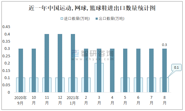 2021年8月中國運動,網球,籃球鞋進出口數量分別為0.1萬噸和0.3萬噸