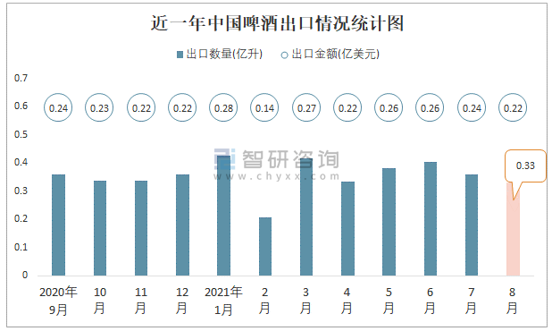 根據中國海關數據顯示:2021年8月中國啤酒進口數量為0.48億升,同比下降34.2%,進口金額為0.67億美元,同比下降18.5%,2021年8月中國啤酒出口數量為0.33億升,同比下降5.9%,出口金額為0.22億美元,同比下降4.5%;2021年1-8月中國啤酒進口數量為3.58億升,進口金額為4.69億美元,出口數量為2.86億升,出口金額為1.88億美元。