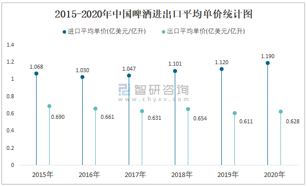 2015-2020年中國啤酒進出口平均單價統計圖
