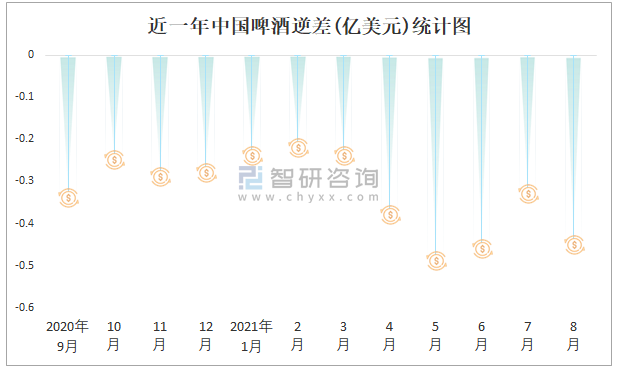 近一年中國啤酒逆差(億美元)統計圖