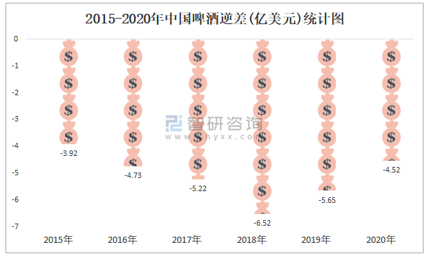 2015-2020年中國啤酒逆差(億美元)統計圖