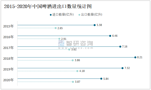 2015-2020年中國啤酒進出口數量統計圖