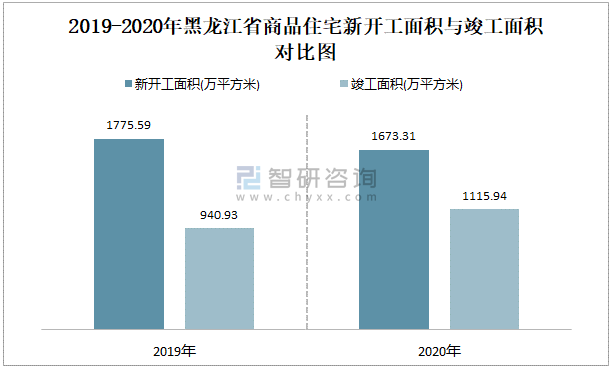 2019-2020年黑龍江省商品住宅新開(kāi)工面積與竣工面積對(duì)比圖