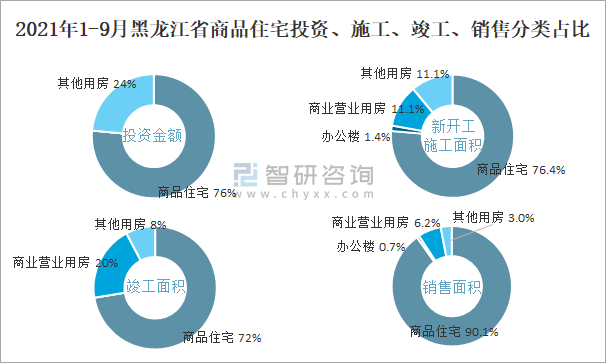 根據(jù)國(guó)家統(tǒng)計(jì)局?jǐn)?shù)據(jù)統(tǒng)計(jì)可知:2021年1-9月黑龍江省房地產(chǎn)開(kāi)發(fā)企業(yè)在商品住宅中投資金額占比為76.5%(注:只有投資金額中其他用房包含辦公樓、商業(yè)營(yíng)業(yè)用房),商品住宅的新開(kāi)工面積與竣工面積所占比重差異不大,從銷售面積來(lái)看,商品住宅為銷售主力(占比高達(dá)90.1%),辦公樓銷售面積占比少于商業(yè)營(yíng)業(yè)用房銷售面積占比。
