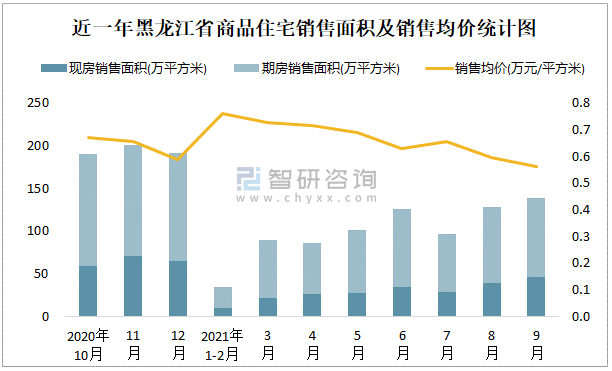 根據(jù)國(guó)家統(tǒng)計(jì)局?jǐn)?shù)據(jù)可知:2021年9月黑龍江省商品住宅銷售面積為138.82萬(wàn)平方米(其中銷售現(xiàn)房46.24萬(wàn)平方米,期房92.58萬(wàn)平方米),銷售額為78.15億元,銷售均價(jià)約為0.56萬(wàn)元/平方米;2021年1-9月黑龍江省商品住宅累計(jì)銷售面積為802.28萬(wàn)平方米,銷售面積累計(jì)同比增長(zhǎng)4.6%,累計(jì)銷售額為521.19億元,銷售額累計(jì)同比下降9.1%;近一年黑龍江省商品住宅銷售均價(jià)2021年1-2月達(dá)到最高值,此后有所下滑,期房銷售面積遠(yuǎn)高于現(xiàn)房銷售面積。
