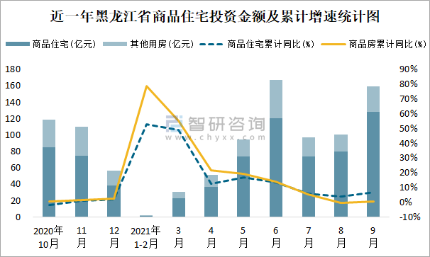 根據(jù)國(guó)家統(tǒng)計(jì)局?jǐn)?shù)據(jù)統(tǒng)計(jì)可知:2021年9月黑龍江省房地產(chǎn)開(kāi)發(fā)投資商品房投資金額為159.26億元(其中商品住宅為128.34億元,辦公樓、商業(yè)營(yíng)業(yè)用房等其他用房30.92億元);2021年1-9月黑龍江省房地產(chǎn)開(kāi)發(fā)投資商品住宅累計(jì)投資金額為537.46億元,投資金額累計(jì)同比增長(zhǎng)6.6%。