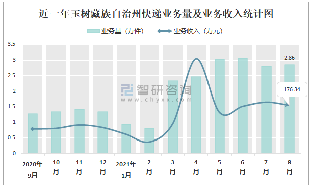 近一年玉樹藏族自治州快遞業務量及業務收入統計圖