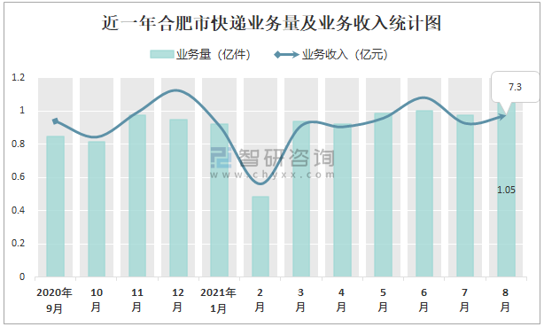 近一年合肥市快遞業務量及業務收入統計圖
