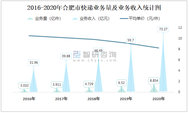 2016-2020年合肥市快遞業務量及業務收入統計圖