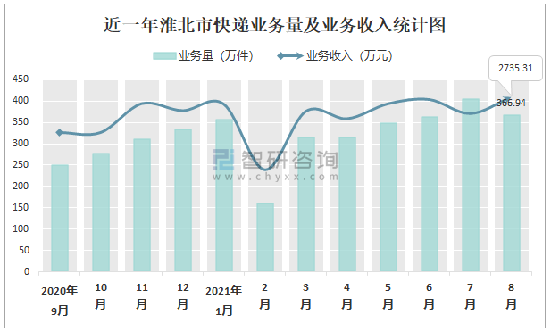 2021年8月淮北市快遞業(yè)務量與業(yè)務收入分別為366.94萬件和2735.31萬元