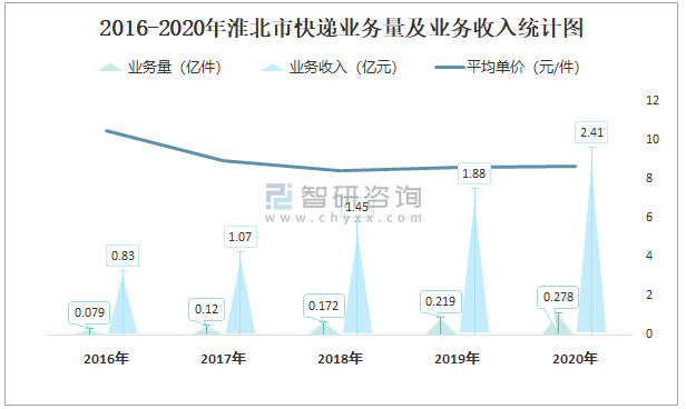 2016-2020年淮北市快遞業(yè)務量及業(yè)務收入統(tǒng)計圖