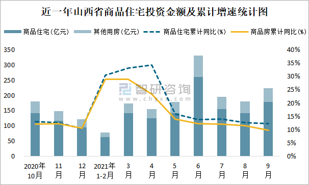 近一年山西省商品住宅投資金額及累計增速統(tǒng)計圖