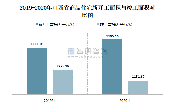 2019-2020年山西省商品住宅新開工面積與竣工面積對比圖