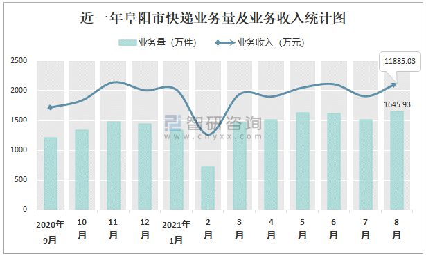 近一年阜陽市快遞業務量及業務收入統計圖