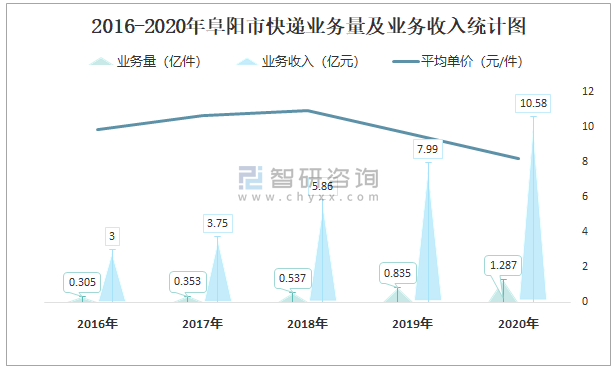 2016-2020年阜陽市快遞業務量及業務收入統計圖